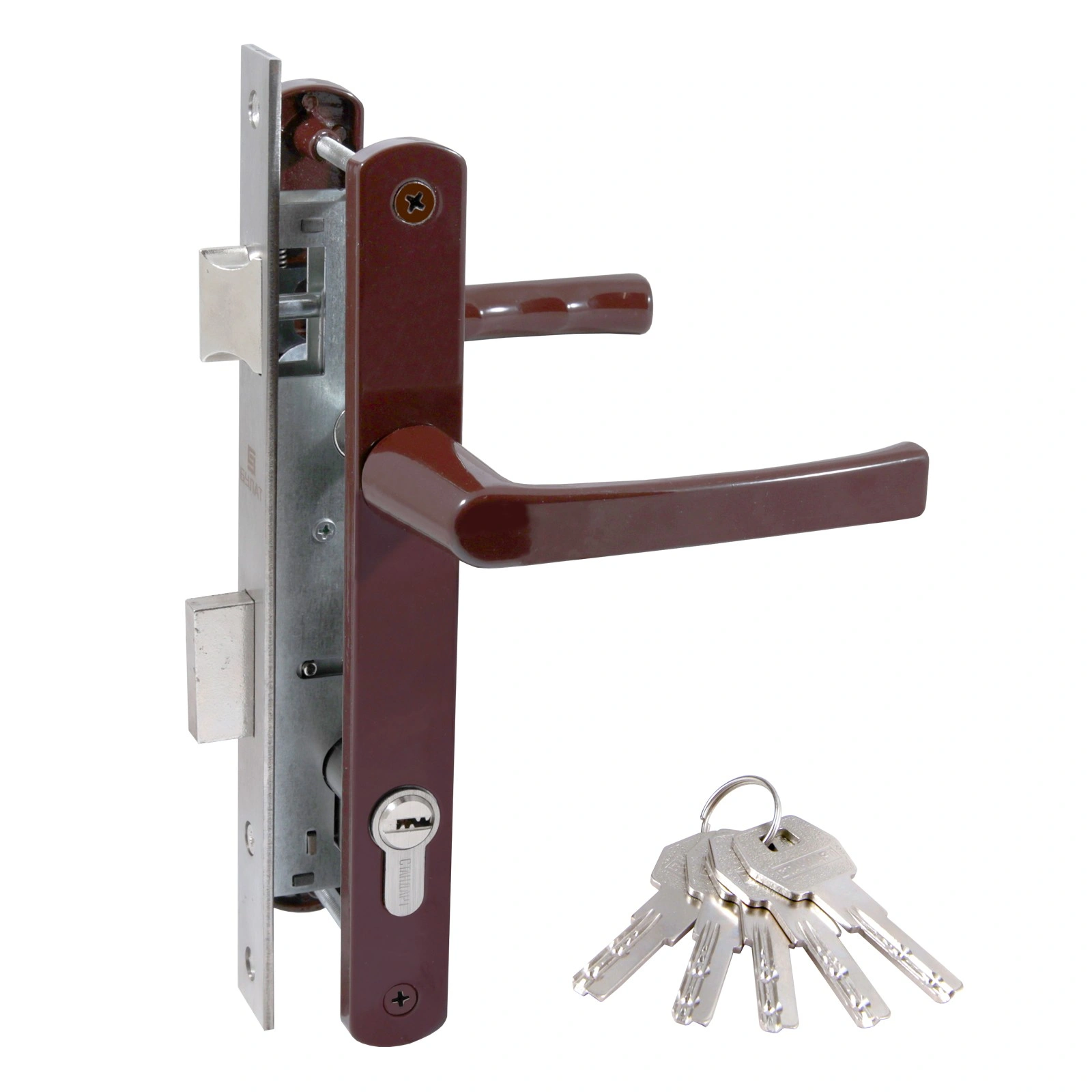 Комплектация: Цилиндровый механизм 80 мм, 5 перфоключей, корпус замка, фалевые ручки, ответная планка, винтовые стяжки, саморезы. Сертифицирован в РФ. Гарантийный срок - 5 лет
