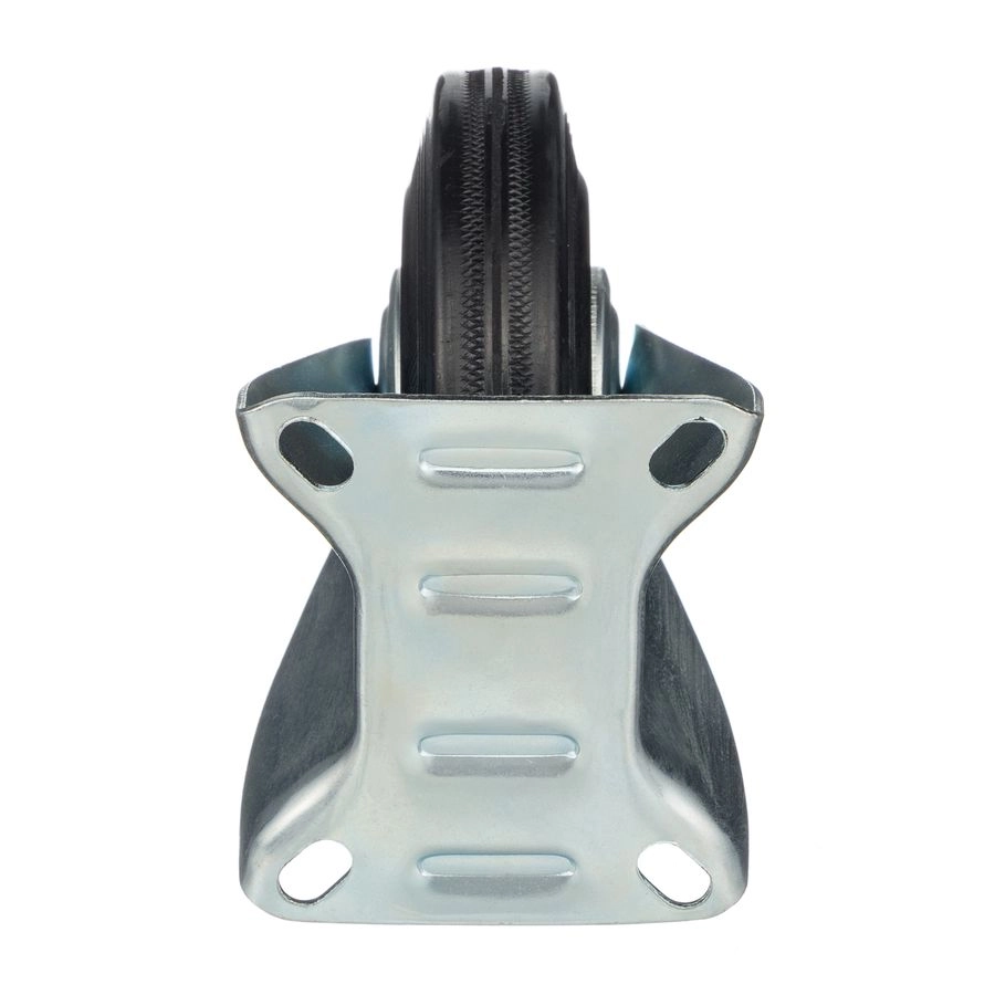 Колесо неповоротное 4002-120, диаметр 120мм., грузоподъемность 100кг. Колеса из черной литой резины, центр из двух гальванизированных дисков из штампованной стали. Роликовый (игольчатый) подшипник расположен в углублении, выдавленном под прессом, и содержит цилиндрические ролики подшипника. Неповоротный кронштейн изготовлен прессованием из листовой стали. Возможно применение на относительно грубых полах складов, заводов, производственных и строительных площадках. Данные колеса можно использовать на неровных поверхностях, во влажной окружающей среде и использовании вне помещения, не рекомендуется применять в среде с органическими растворителями, хлорированными веществами, гидрокарбонатами и минеральными маслами. Температура эксплуатации от -20 до +70С.