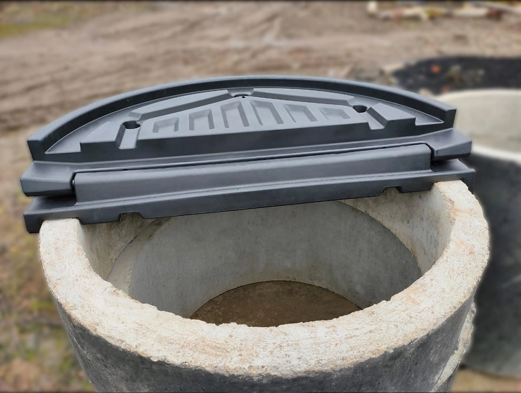 Складывающаяся пополам крышка для колодцев диаметром 1000 мм. Изготовлена из ударостойкого пластика.