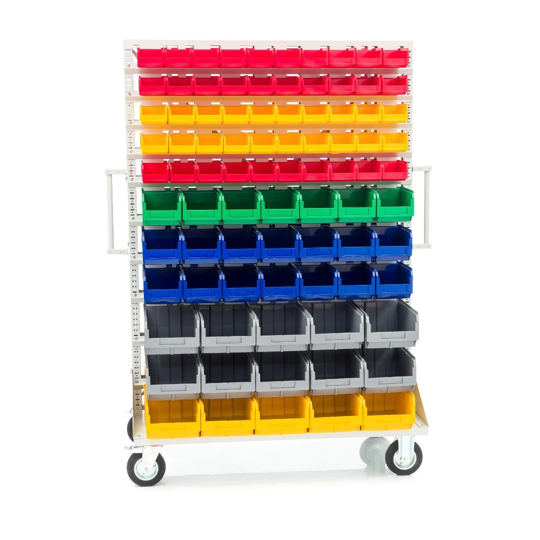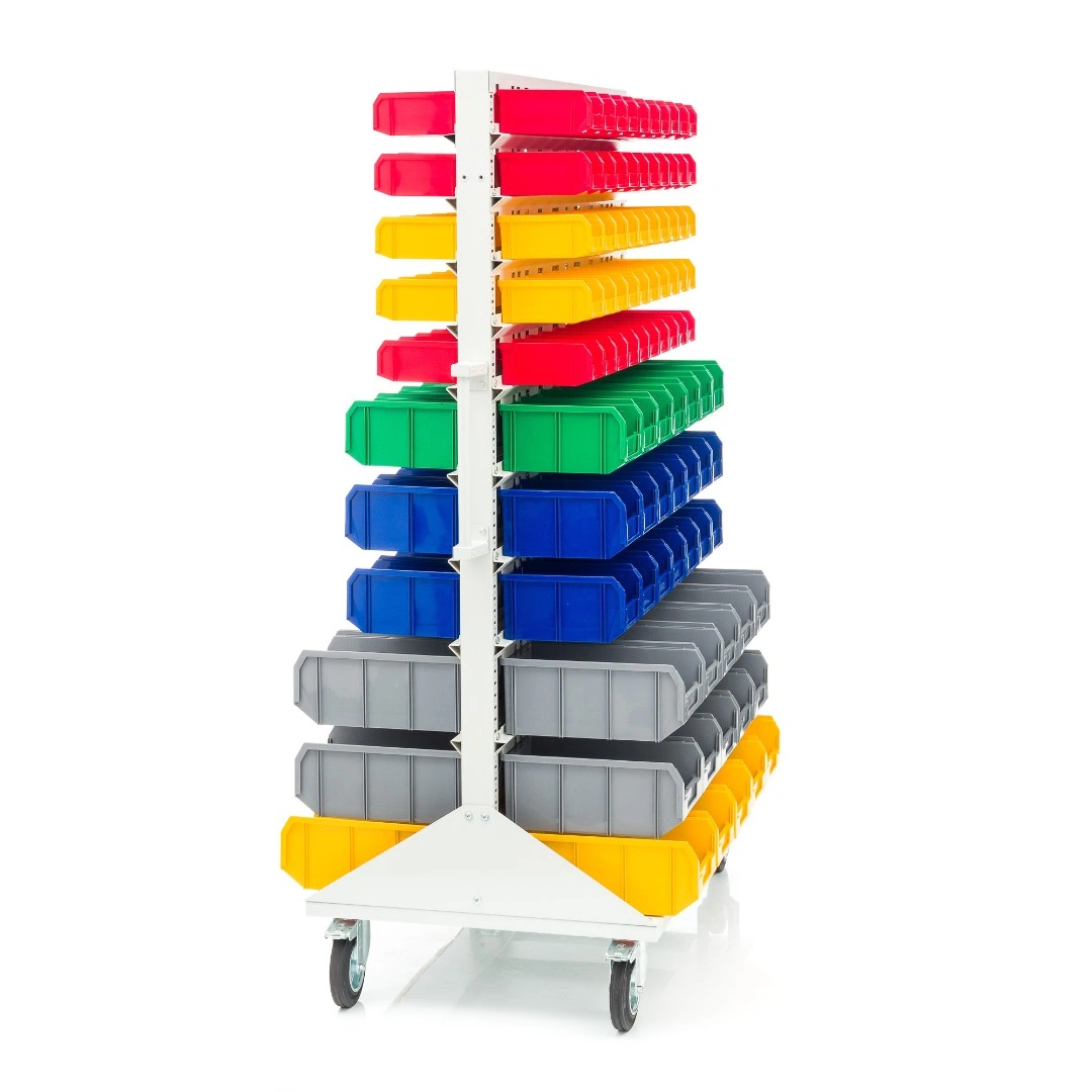 Мобильная стойка M2-100-42-15 - это универсальная модель, которая находит применение на крупных складах, в торговых центрах, а также в различных специализированных мастерских. Пластиковые ящики подвешены на высокопрочных направляющих, которые способны выдерживать распределенную нагрузку до 40 кг. каждая. Наличие 4 колес, 2 из которых поворотные с тормозом, значительно облегчают процесс транспортировки стойки по помещению и фиксации в нужном месте. Наличие большого количества ящиков малой и большой вместимости дает возможность хранения всевозможных ручных инструментов и приспособлений. Комплектация: Стойка под пластиковые ящики 1150х1500мм. без опоры серия К; Опора стойки двусторонняя комплект 2шт., серия К; Платформа мобильная 700х1150мм., под точки крепления колеса 80х60мм. + 2 ручки, серия К; Держатель для стойки 1150мм. - серый, распределенная нагрузка до 40кг. на ряд, серия К- 20 шт.; Колесо 535431 диаметр 150мм., металл, резина, поворотное с тормозом - 2 шт.; Колесо 535911 диаметр 150мм., металл, резина, неповоротное - 2 шт.; V-1 Пластиковый ящик 172х102х75 мм. - 100 шт.; V-2 Пластиковый ящик 234х149х120мм. - 42 шт.; V-3 Пластиковый ящик 341х207х143 мм. - 30шт.; Упаковка. Технические характеристики: ширина 1150мм., высота 1500мм., глубина 700мм. Преимущества мобильной стойки M2-100-42-15 - ящики открытого типа, которые позволяют находить нужные позиции в считанные секунды - это возможно благодаря хорошему визуальному обзору содержимого. Конструкция позволяет максимально эффективно организовать пространство для хранения различных мелкоштучных изделий, таких как крепеж, автозапчасти, сантехнические комплектующие и прочие небольшие предметы. Конструкция стеллажа позволяет одним движением руки извлекать нужный ящик для его наполнения или опустошения, и так же легко устанавливать его на место. Удобная рукоятка для транспортировки. Плавный ход. Высокая мобильность. Нагрузка до 30кг. на ящик. Быстрая сборка. Максимальная грузоподъемность - 400кг. Габариты - 1150х700х1500мм.