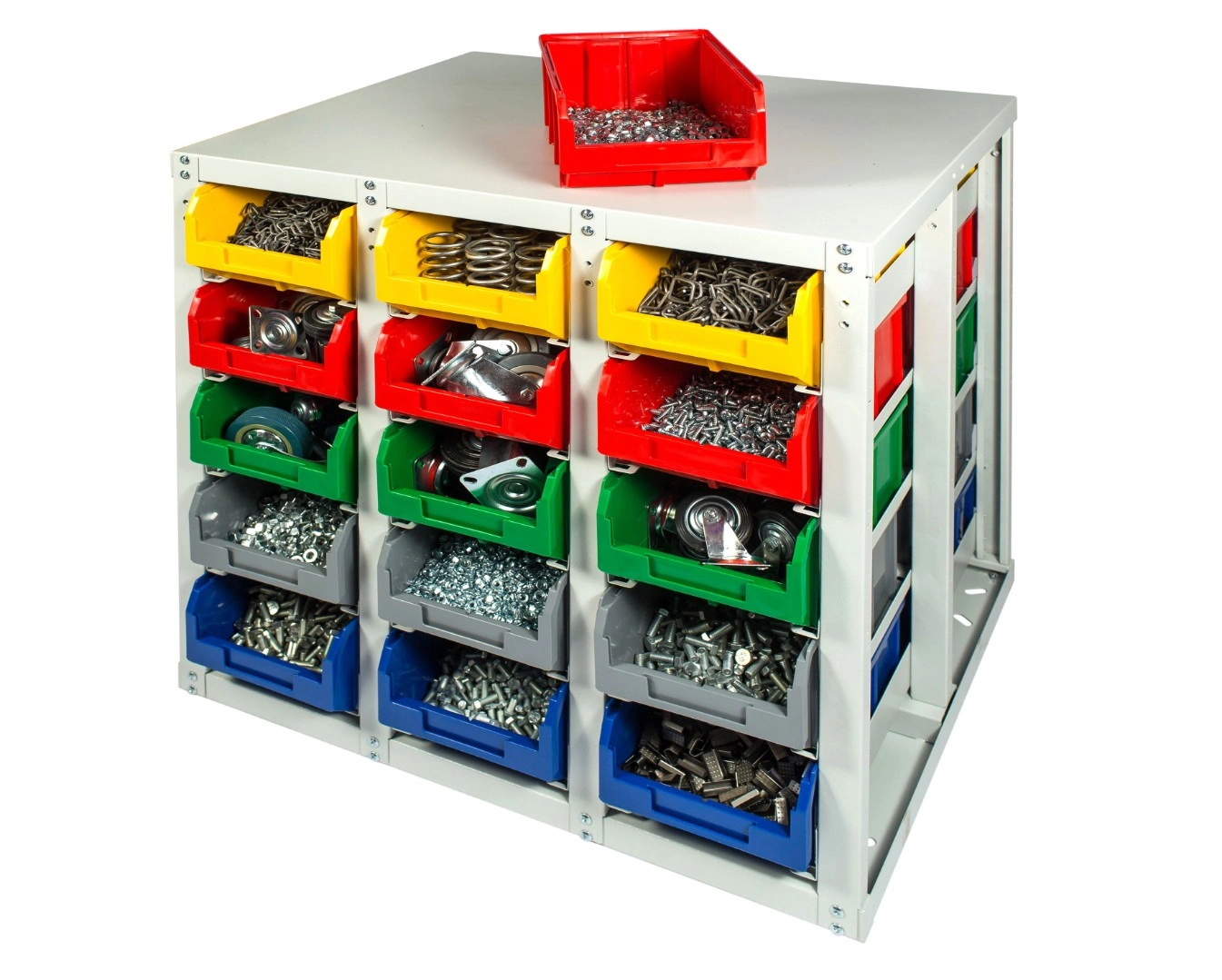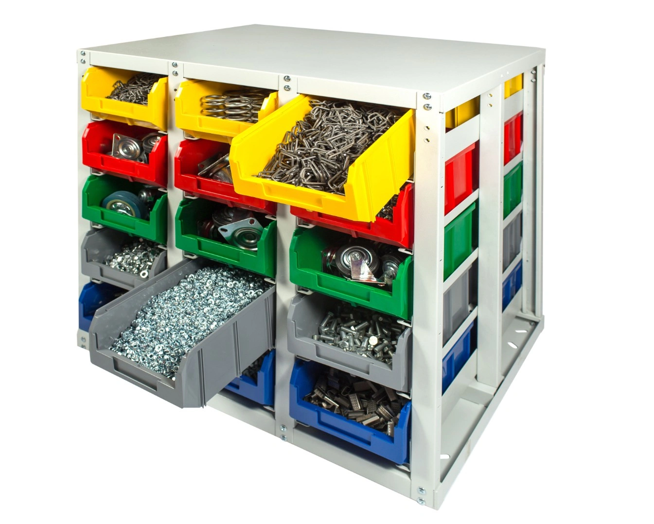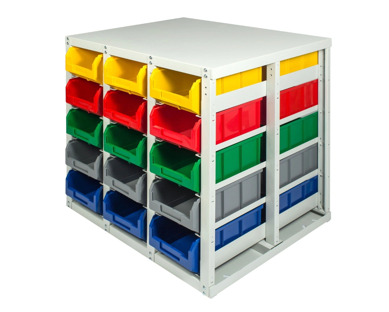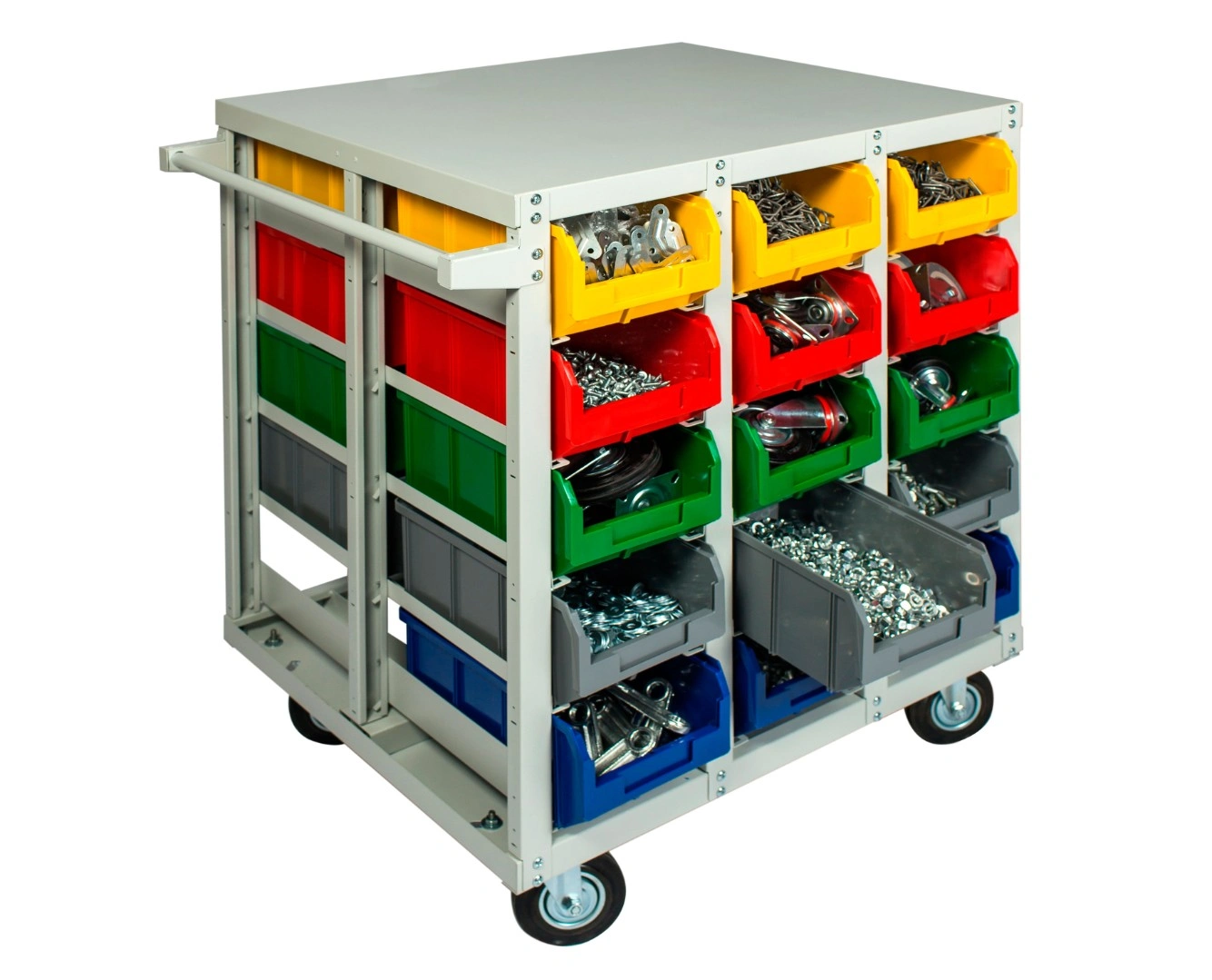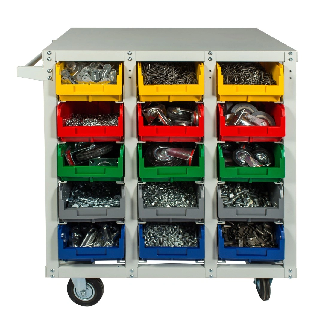 Стеллаж с направляющими мобильный двусторонний V3-30 ячеек (150И), грузоподъемность 400кг., предназначен для размещения ящиков V-3 в отдельных ячейках на продольных направляющих. Подходит для эксплуатации в автомастерских, в строительных магазинах, на складах, где необходимо складирование мелкоштучных изделий и инструментов. При использовании вместе с колесами, данный стеллаж становится мобильным, что значительно расширяет его функциональные возможности для перемещения хранимых вещей груза, по территории предприятия, склада, цеха. Конструкция ящиков модели V3 обеспечивает быстрый и легкий доступ. Ящики открытого типа позволяют быстро находить нужные позиции, это возможно благодаря хорошему визуальному обзору содержимого. Конструкция стеллажа позволяет одним движением руки извлекать нужный ящик для его наполнения или опустошения, и так же легко устанавливать его на место; Стеллаж поставляется в разобранном виде и состоит из: металлического каркаса стеллажа, с направляющими одностороннего V3-30 ячеек - 1 шт.; ящиков пластиковых модель V-3 - 30 шт.; комплекта итальянских колес Tellure Rota, резина, сталь диаметром 150мм.; ручки. Температурный режим эксплуатации от +20 до +70С.