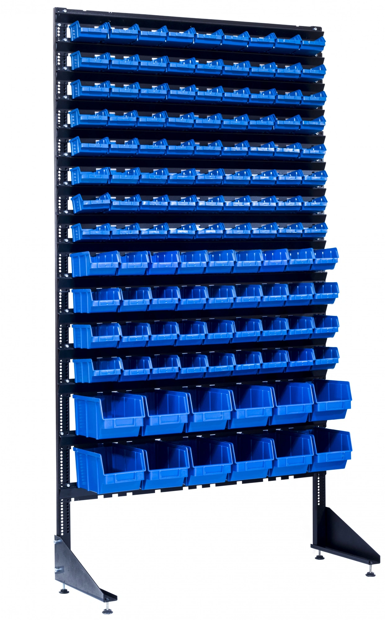 Конструкция данного оборудования, позволяет комбинировать ящиками разных размеров. Перфорация на стойке, позволяет менять шаг в зависимости от размера лотка. Траверсы крепятся на стойку болтами М6, (болты в комплекте).