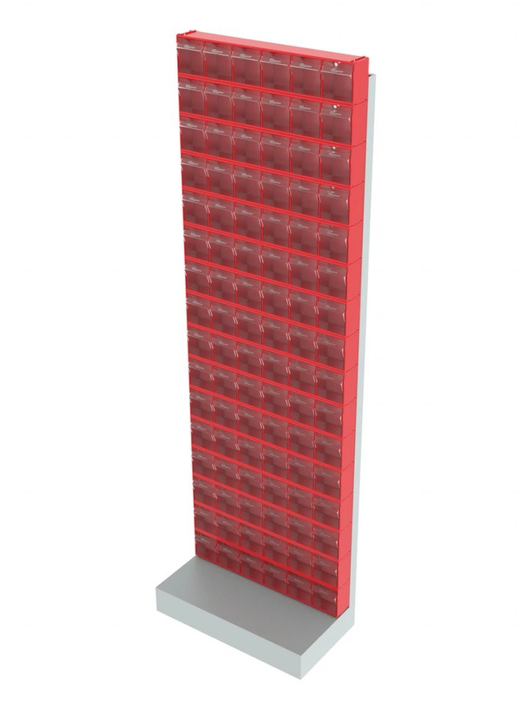 Стойка напольная Стелла-техник 405-00-16-00 (610х325х1850) представляет собой удобную систему хранения на основе откидных коробов. Стойка подойдет для выставочных залов, магазинов, офисов, складов. Комплектация: Рама FOX (610х325х1850) V405 напольная односторонняя с основанием - 1 шт.; Короб откидной Стелла-техник F-600-6 , 600х96х112мм, 6 ячеек, красный, прозрачный – 16 шт.; Упаковка. Преимущества: Металлическое основание; Значительная устойчивость; Хорошая вместимость; Длительный срок службы.