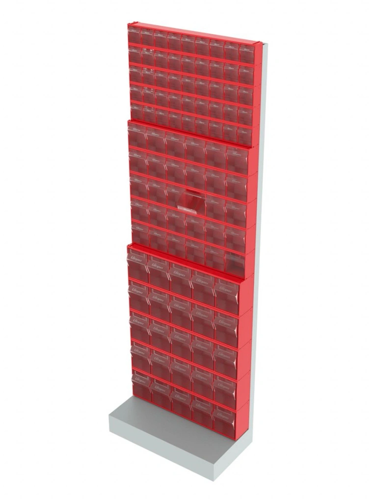 Стойка напольная Стелла-техник 405-05-05-05 (610х325х1850) представляет собой удобную систему хранения на основе откидных коробов. Стойка подойдет для выставочных залов, магазинов, офисов, складов. Комплектация: Рама FOX (610х325х1850) V405 напольная односторонняя с основанием - 1 шт.; Короб откидной Стелла-техник F-600-9 , 600х68х78мм, 9 ячеек, красный, прозрачный -5 шт.; Короб откидной Стелла-техник F-600-6 , 600х96х112мм, 6 ячеек, красный, прозрачный – 5 шт.; Короб откидной Стелла-техник F-600-5 , 600х140х168мм, 5 ячеек, красный, прозрачный – 5 шт.; Упаковка. Преимущества: Металлическое основание; Значительная устойчивость; Хорошая вместимость; Длительный срок службы.