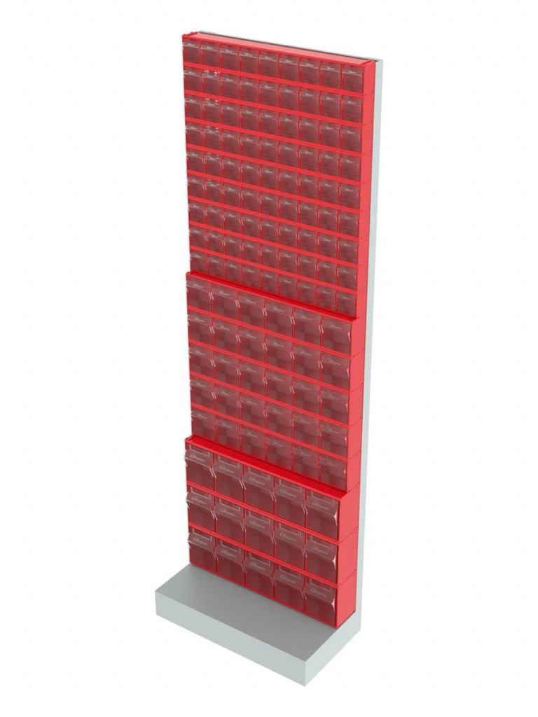 Стойка напольная Стелла-техник 405-09-05-03 (610х325х1850) представляет собой удобную систему хранения на основе откидных коробов. Стойка подойдет для выставочных залов, магазинов, офисов, складов. Комплектация: Рама FOX (610х325х1850) V405 напольная односторонняя с основанием - 1 шт.; Короб откидной Стелла-техник F-600-9 , 600х68х78мм, 9 ячеек, красный, прозрачный - 9 шт.; Короб откидной Стелла-техник F-600-6 , 600х96х112мм, 6 ячеек, красный, прозрачный – 5 шт.; Короб откидной Стелла-техник F-600-5 , 600х140х168мм, 5 ячеек, красный, прозрачный – 3 шт.; Упаковка. Преимущества: Металлическое основание; Значительная устойчивость; Хорошая вместимость; Длительный срок службы.