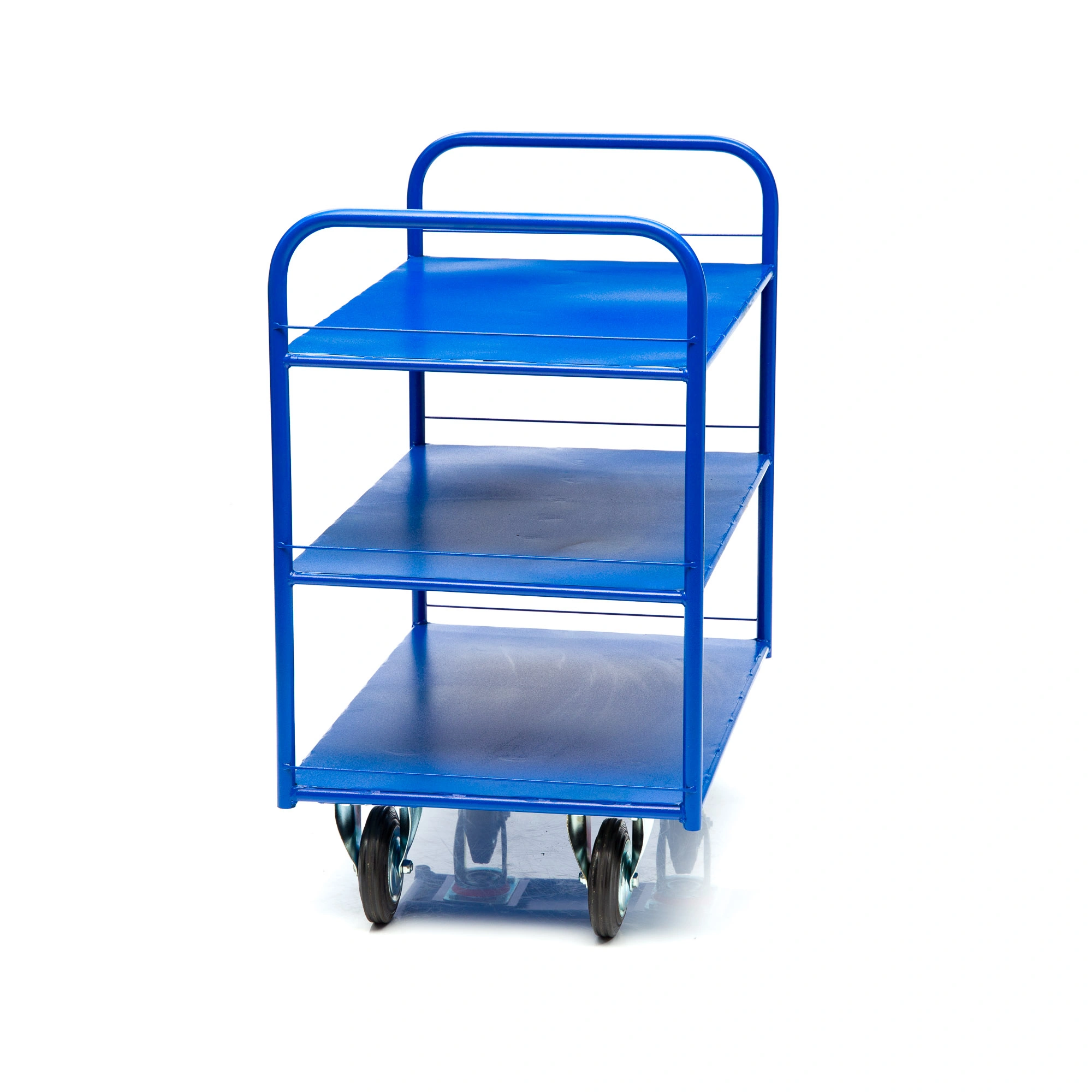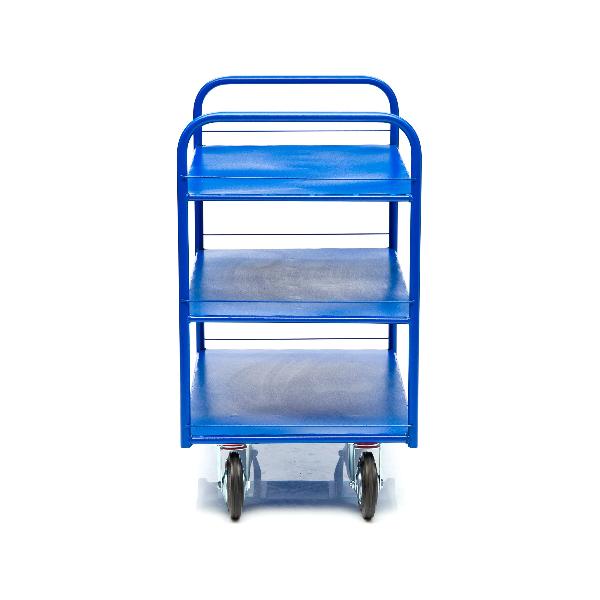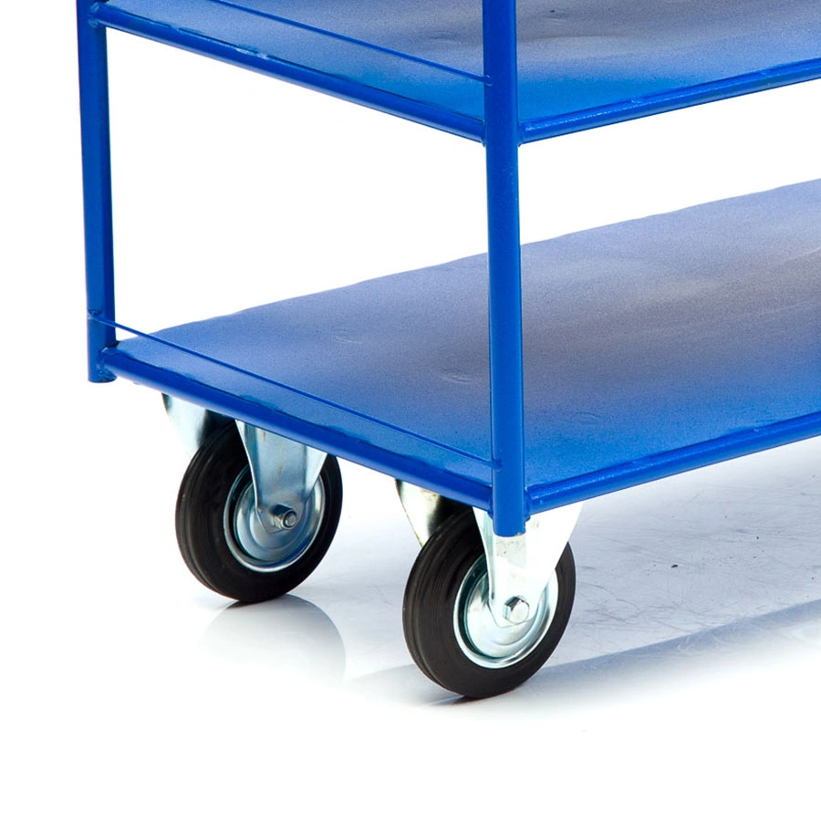 Платформенная трехъярусная 4-х колесная тележка КР-3-125-И предназначена для перевозки малогабаритных грузов. Платформа металлическая толщина листа 1,2мм. Размер платформы 600х900мм. Расстояние между ярусами 300мм. Количество ярусов 3 шт. Габаритная высота 1000мм. Покрытие полимерное. Цвет - синий, шагрень. Тележка КР-3-125-И комплектуется: двумя поворотными и двумя неповоротными промышленными колесами, диаметром 125мм., из черной стандартной резины, от всемирно известного, ведущего итальянского производителя Tellure Rota, метизами для крепления. Благодаря наличию трех ярусов, тележка широко используется на складах, в торговых павильонах, а также в гостиничном и ресторанном бизнесе. Грузоподъемность до 390кг.