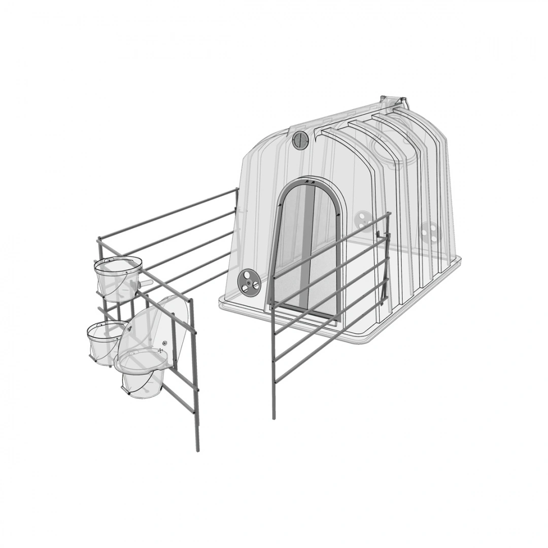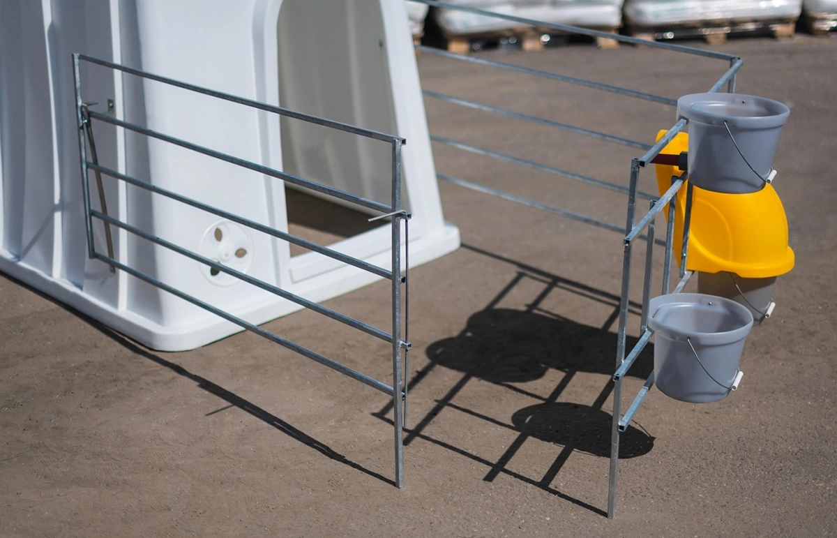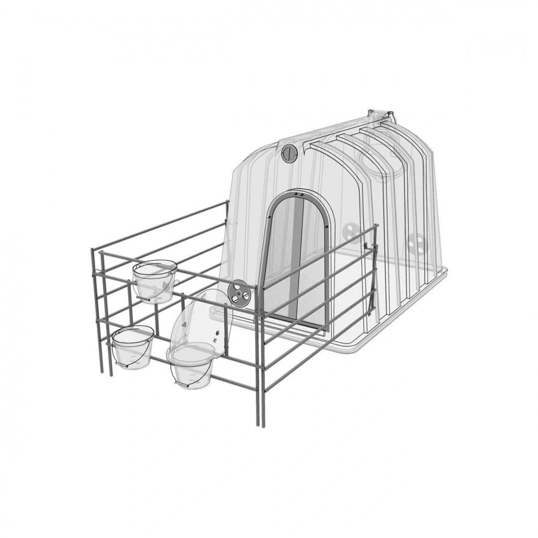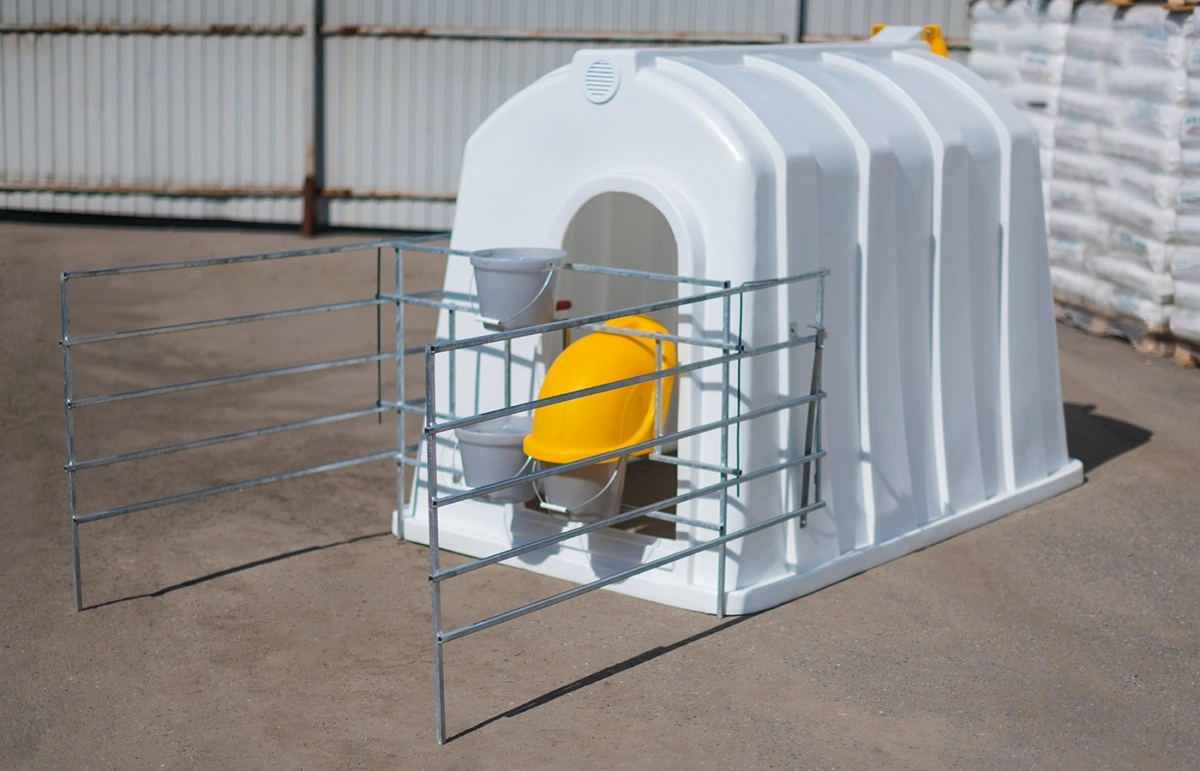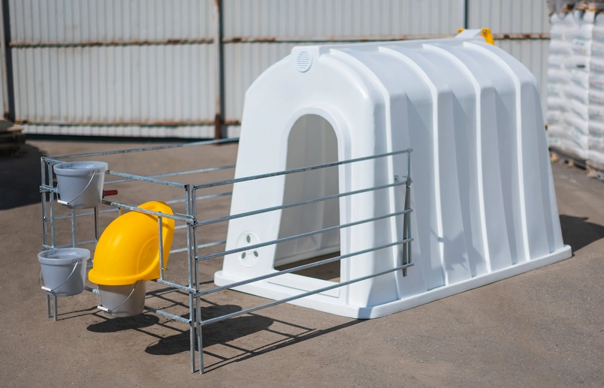 Рекомендуем для эксплуатации с индивидуальным большим домиком для телят, фермерскими ведрами для воды и корма, защитным колпаком, ведром для выпойки и пологом.