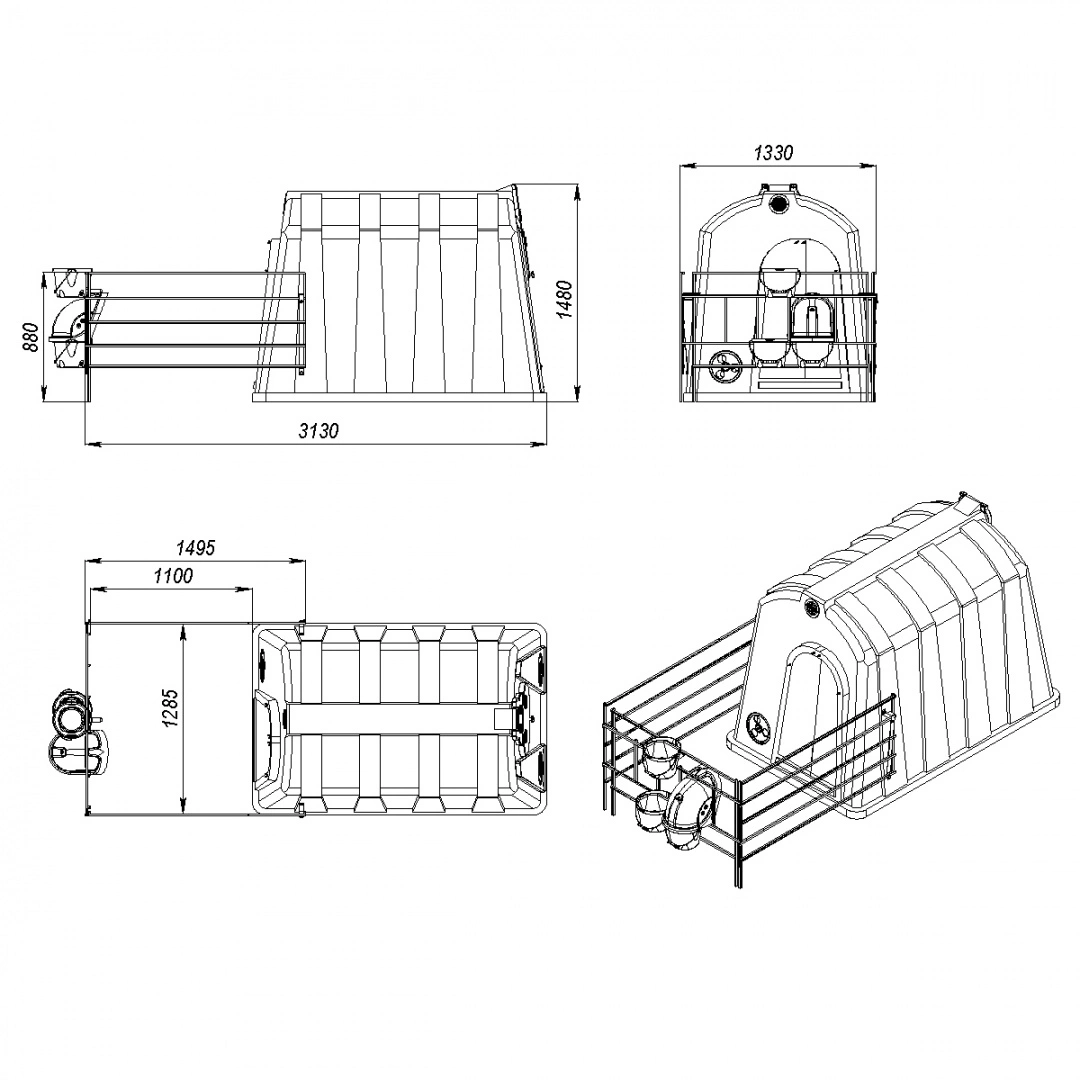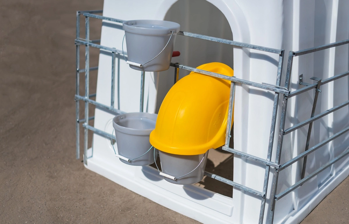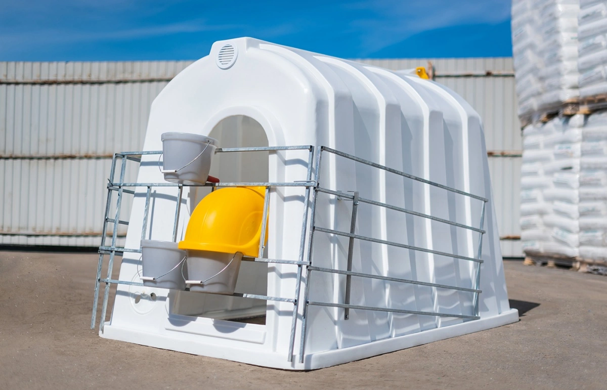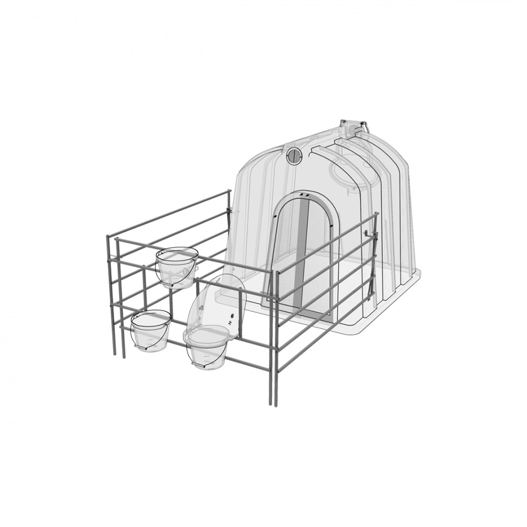 Рекомендуем для эксплуатации с индивидуальным большим домиком для телят, фермерскими ведрами для воды и корма, защитным колпаком, ведром для выпойки и пологом.